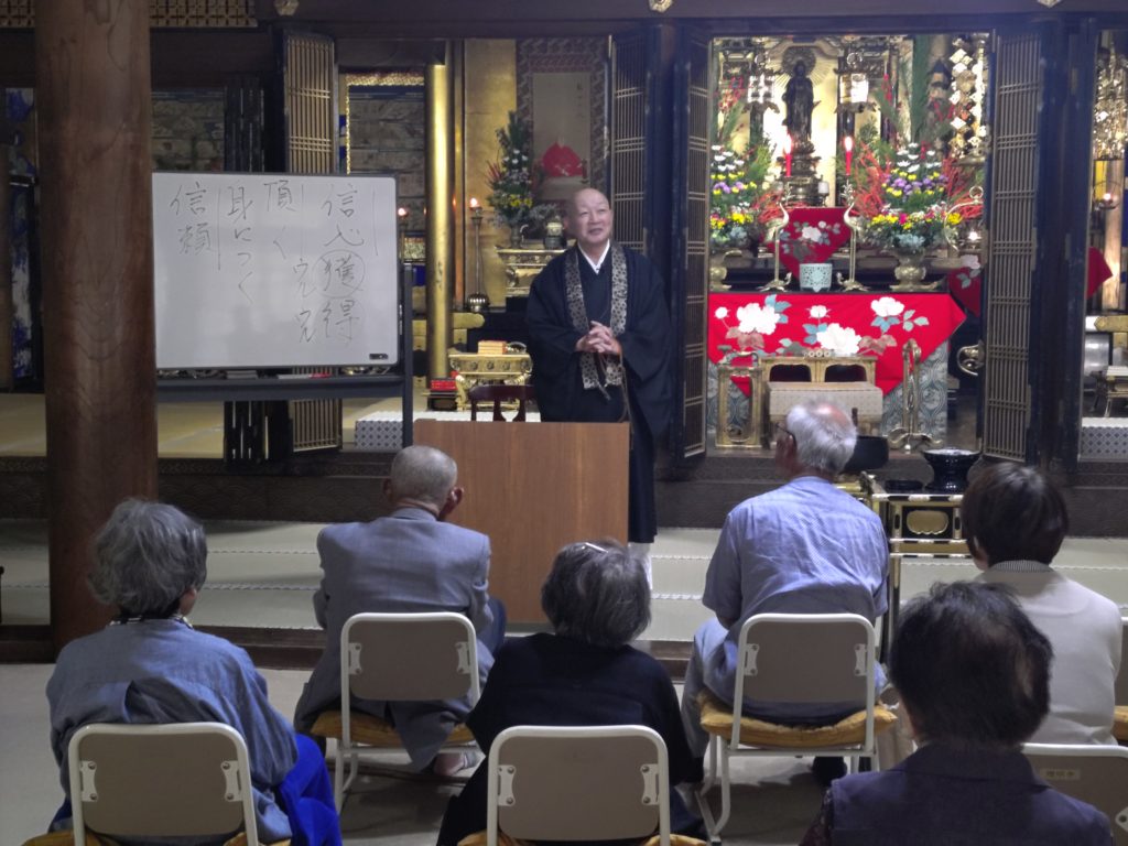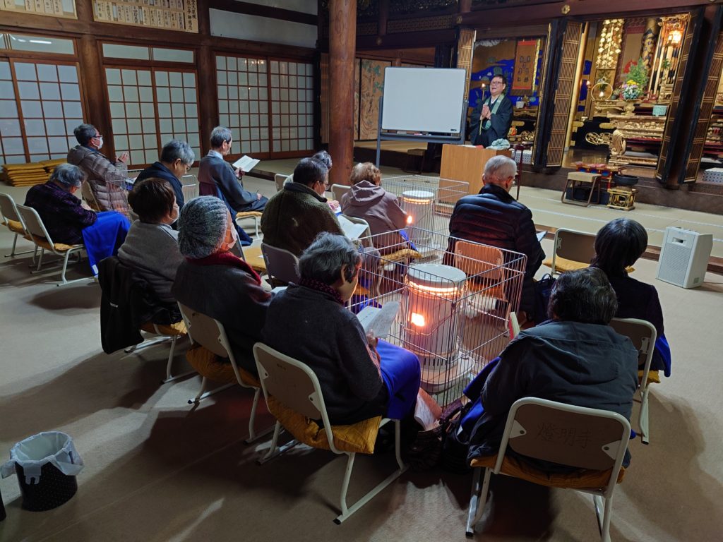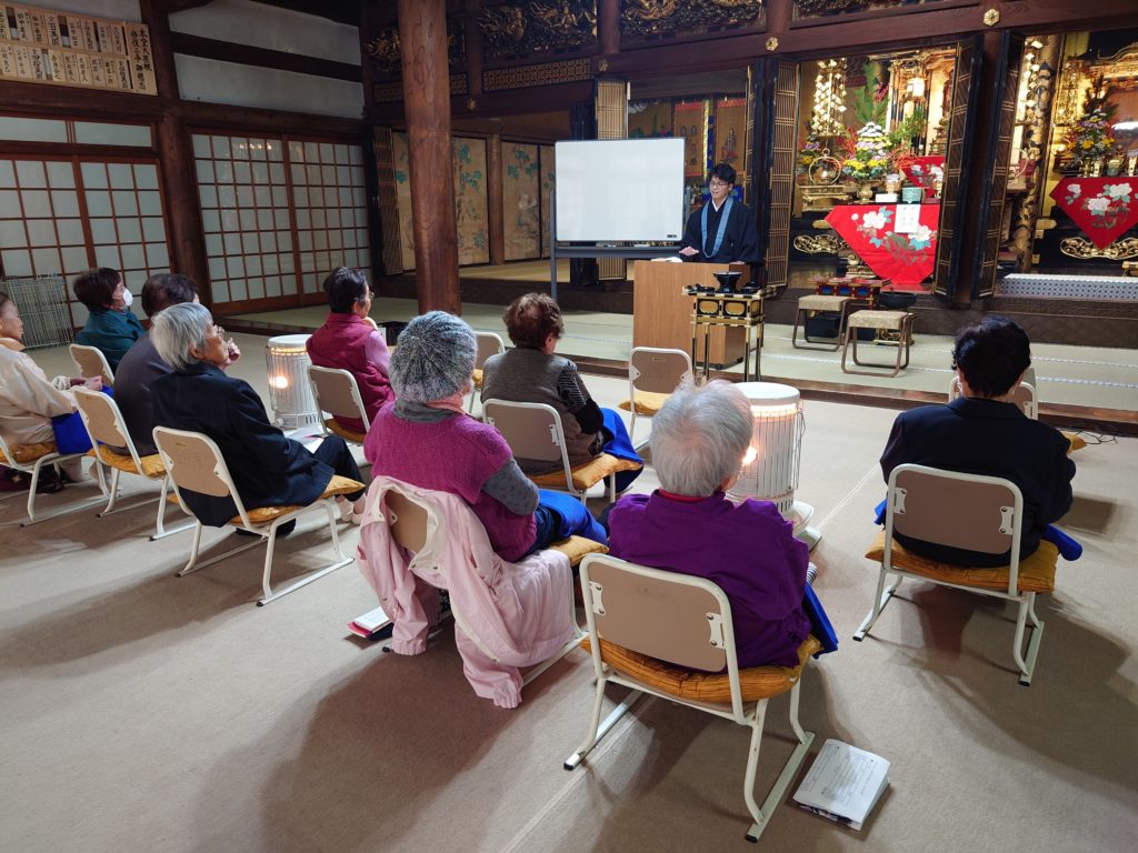 いつものように正信偈のお勤めをした後、今回は仏教歌の「衆会」「みほとけは」をうたいました
