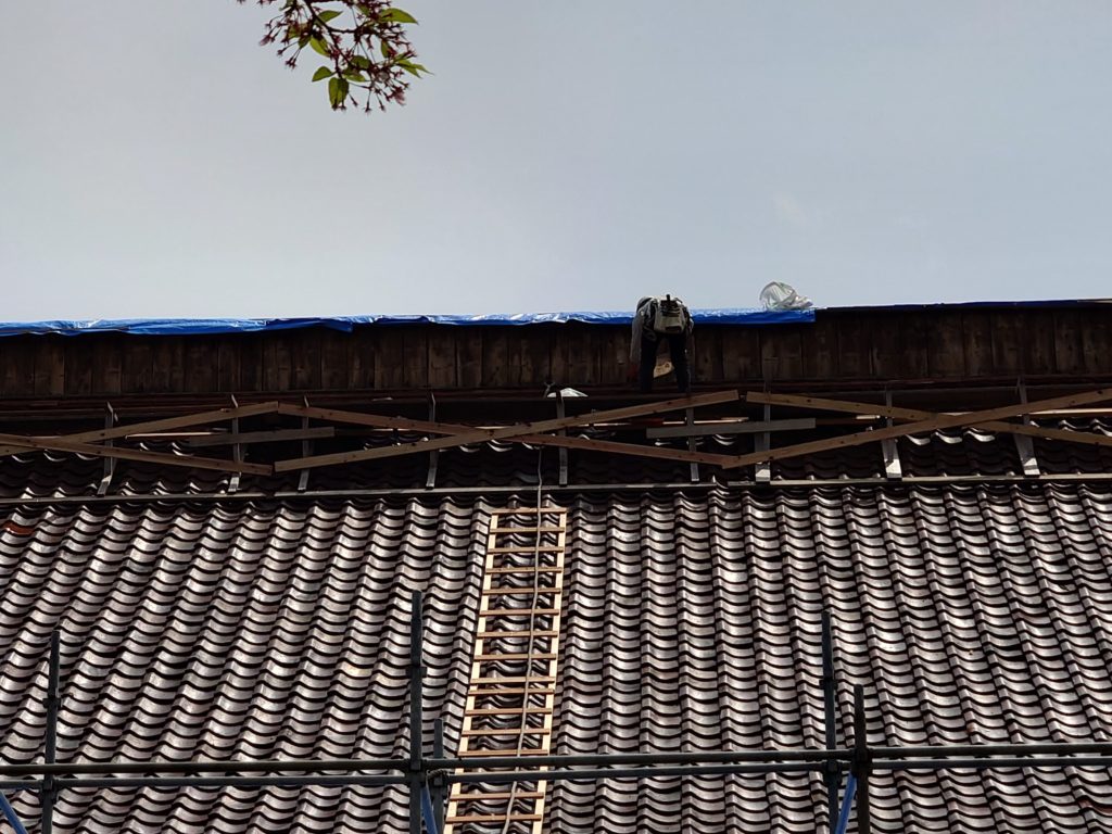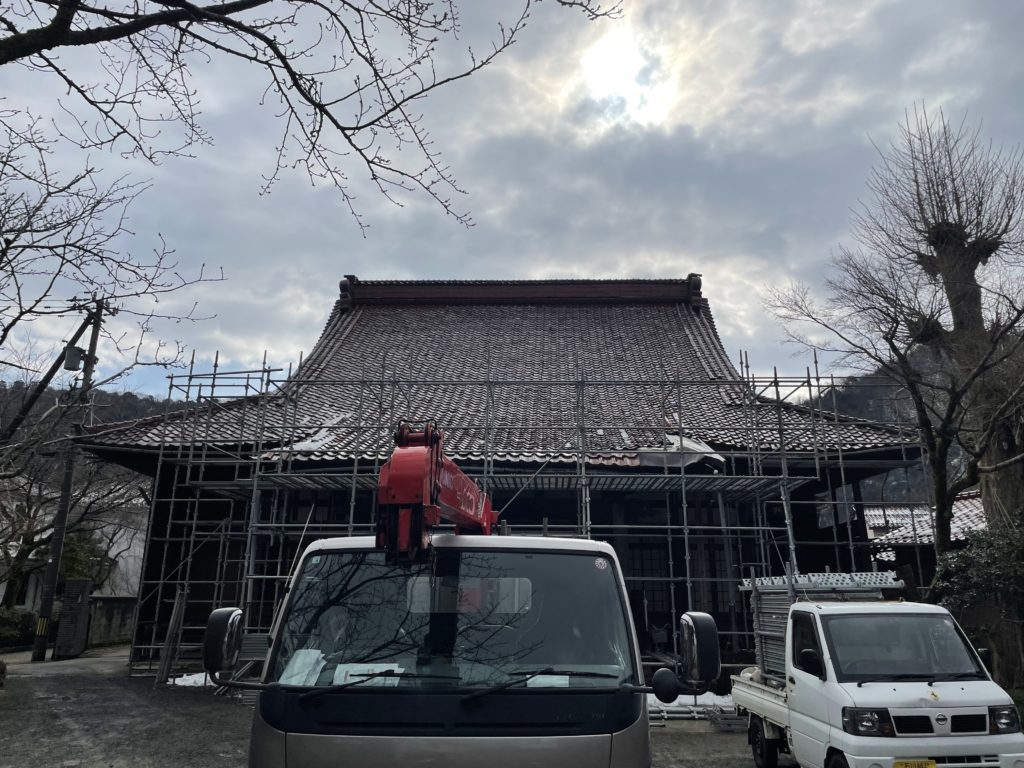 大屋根修復工事、順調に進んでいます。既存の瓦を取り外していってます。