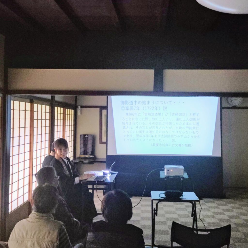蓮如上人ゆかりの寺である当寺ですので、副住職が蓮如上人のご生涯や当寺の縁起、また御影道中のお話などをいたしました。今年はプロジェクターをつかって、パワーポイント資料やyoutubeの映像も交えながら話をしました。
