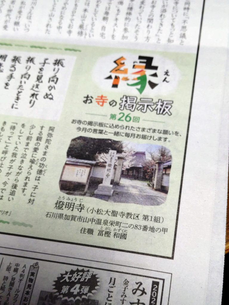 来月号の同朋新聞で燈明寺の法語掲示板が紹介されています