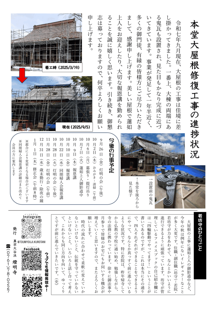 来月の報恩講や蓮如上人御影道中のおしらせ、もうすぐ完成の大屋根の写真などの掲載があるのでぜひご覧ください!