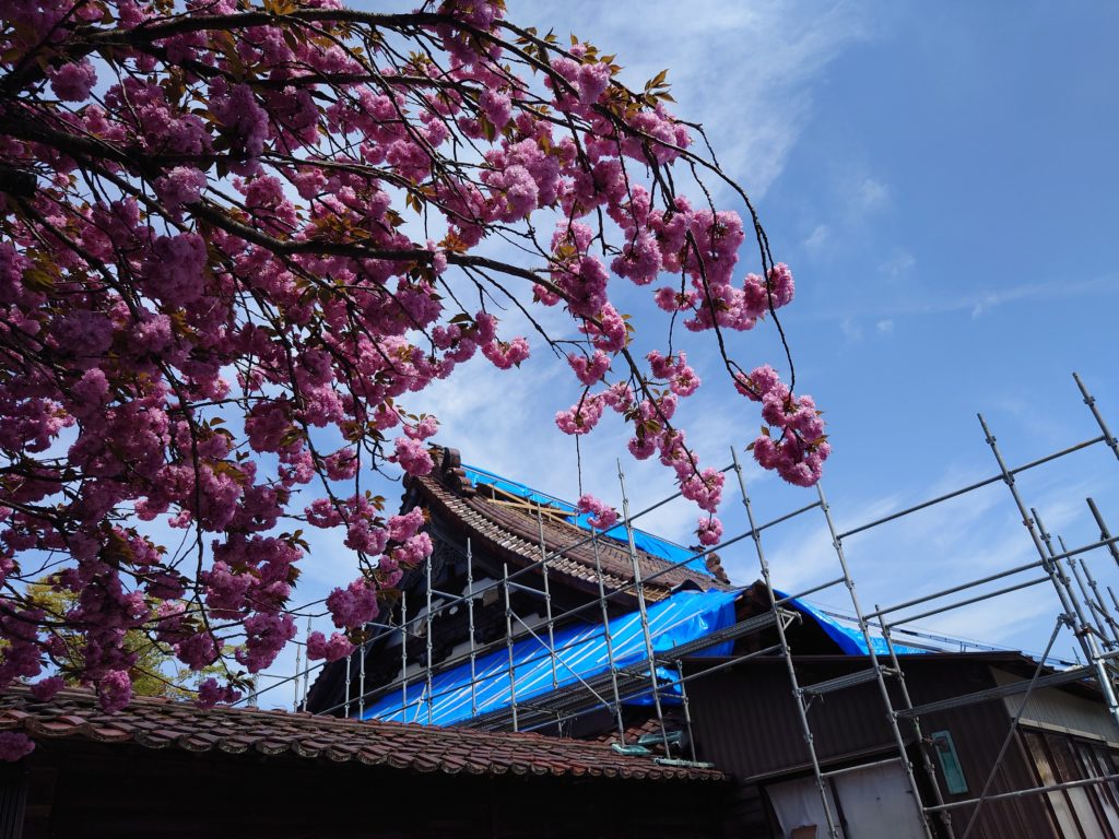 正面だけでなく、裏側の瓦めくりも進んでいます。裏庭では八重桜が開花していて、工事風景に花を添えています