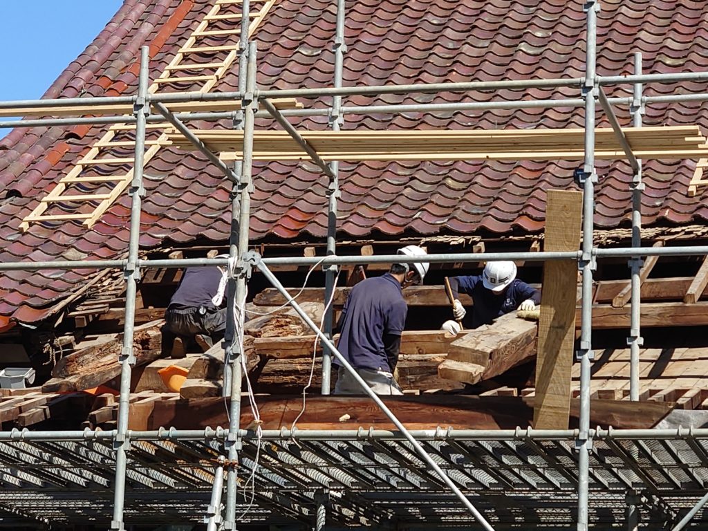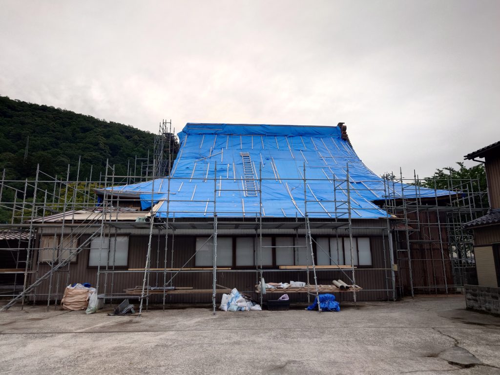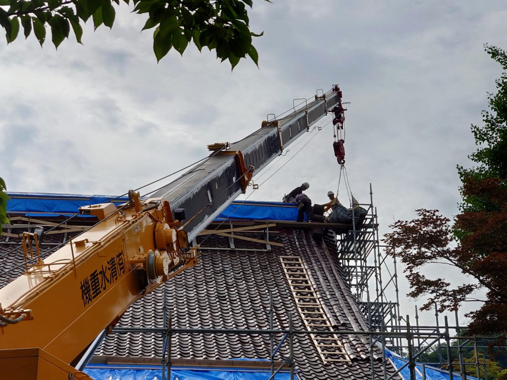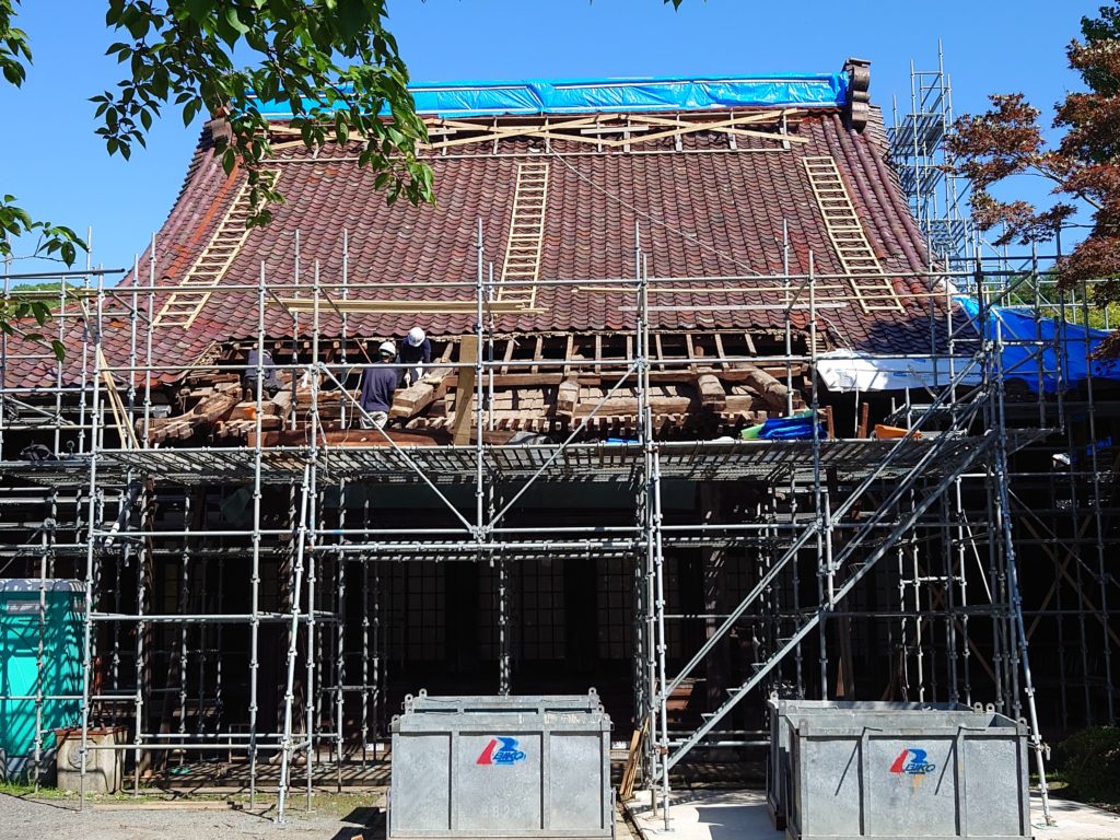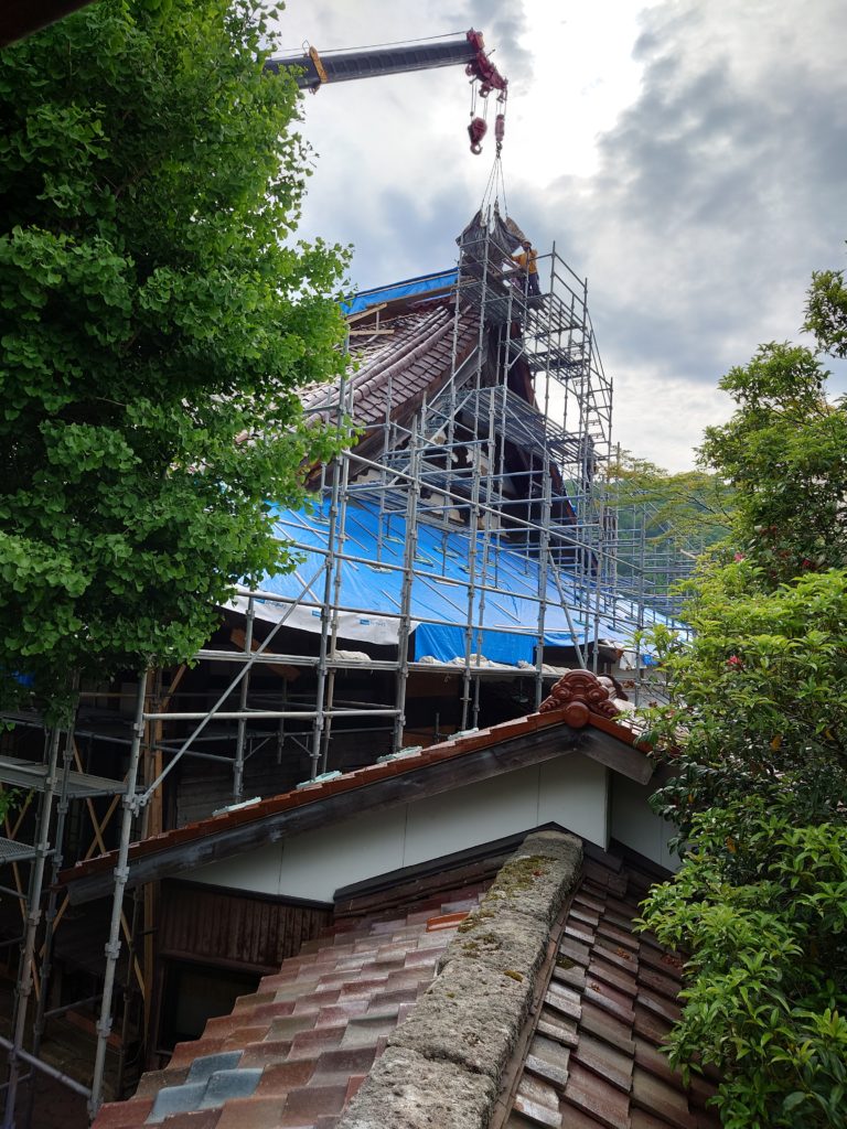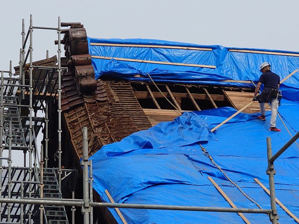 大屋根修復工事、順調に進んでいます。既存の瓦を取り外していってます。