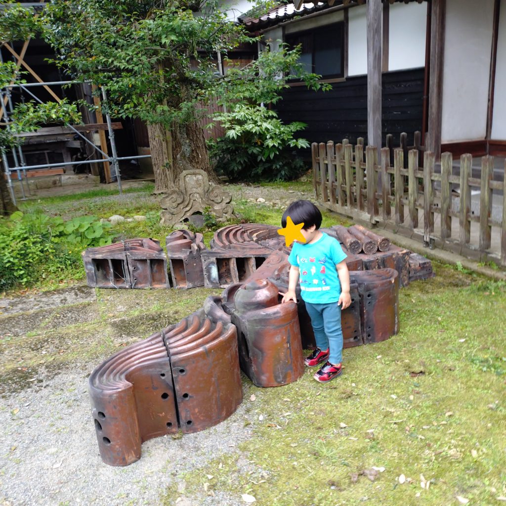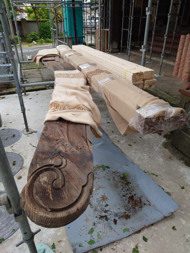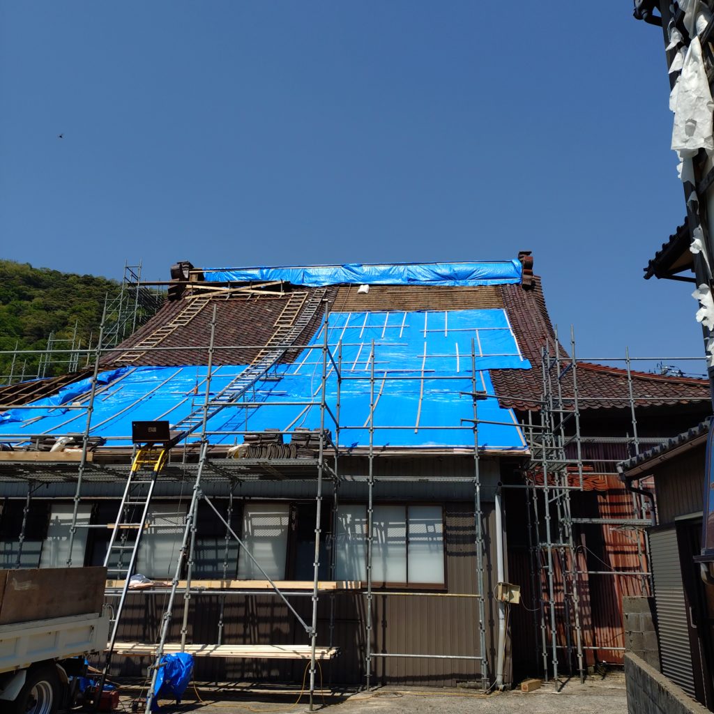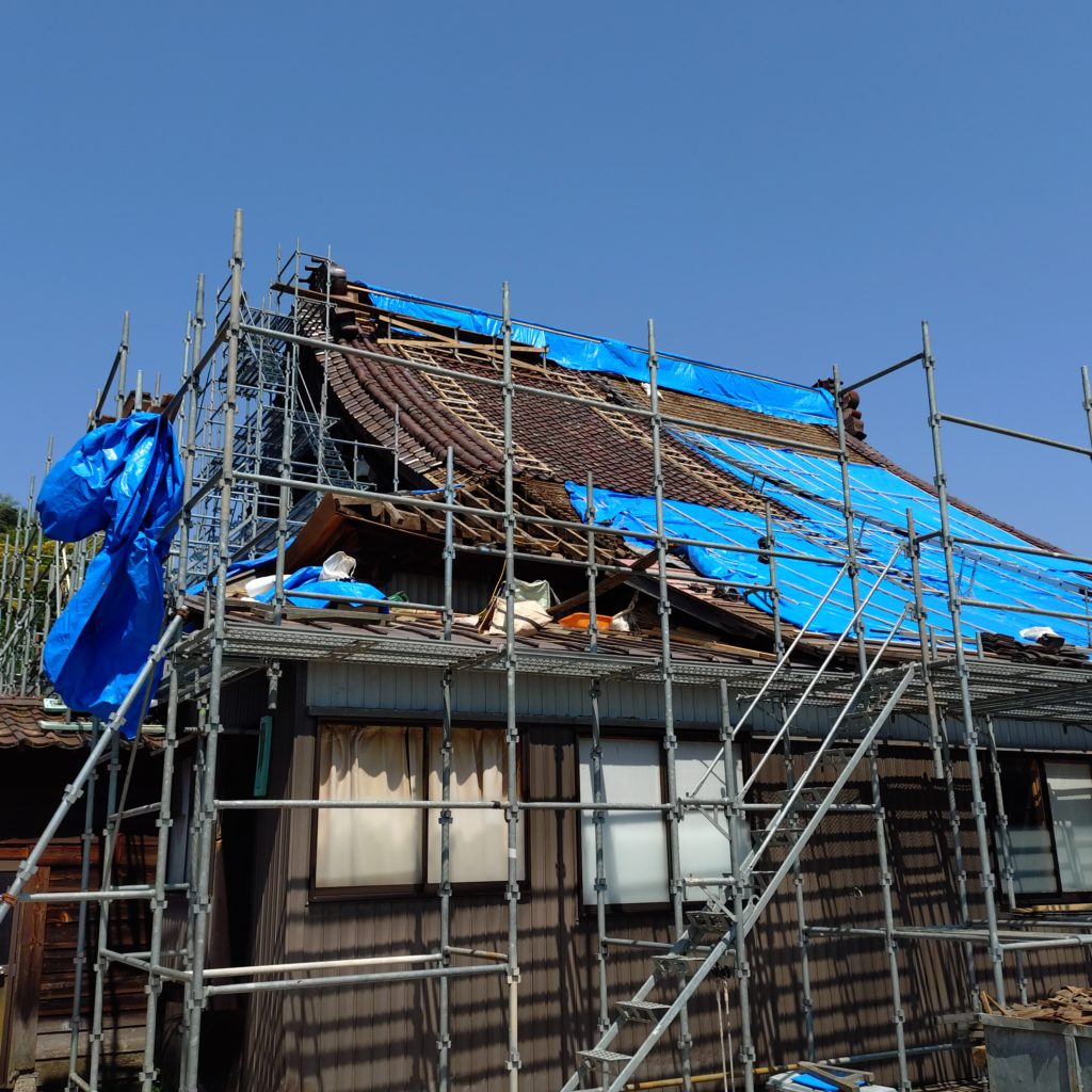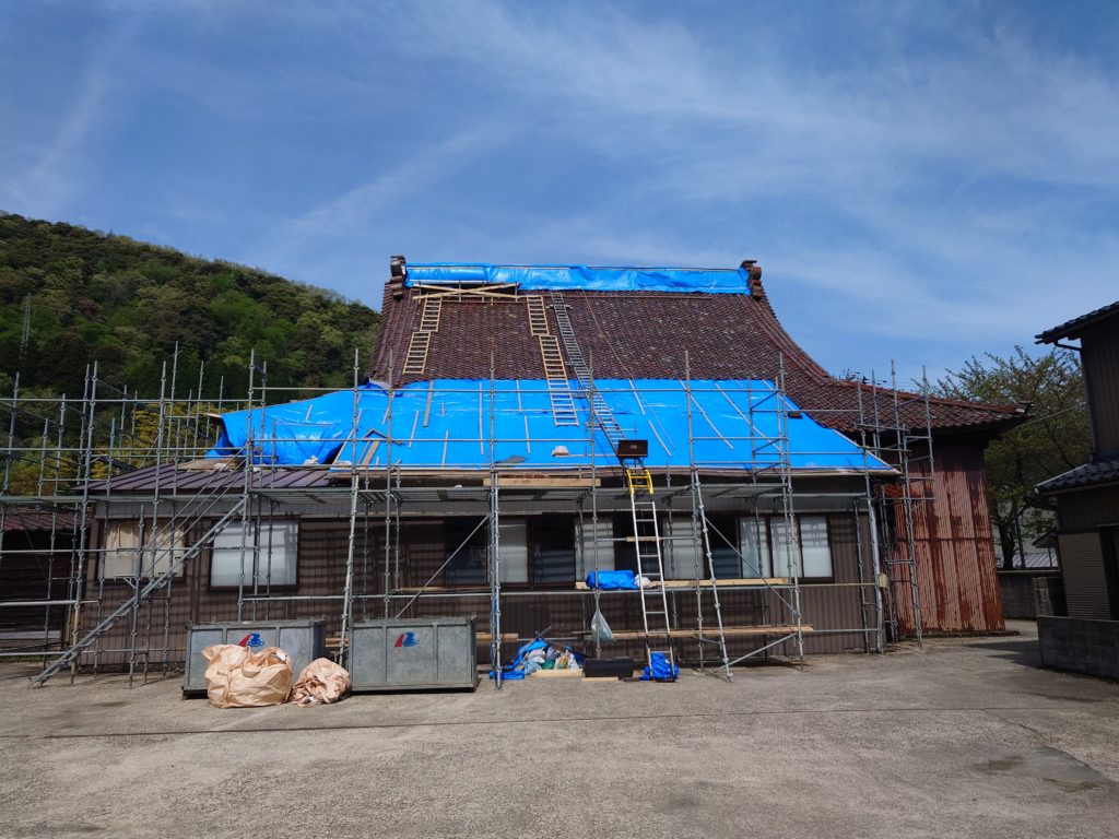 大屋根修復工事、順調に進んでいます。既存の瓦を取り外していってます。